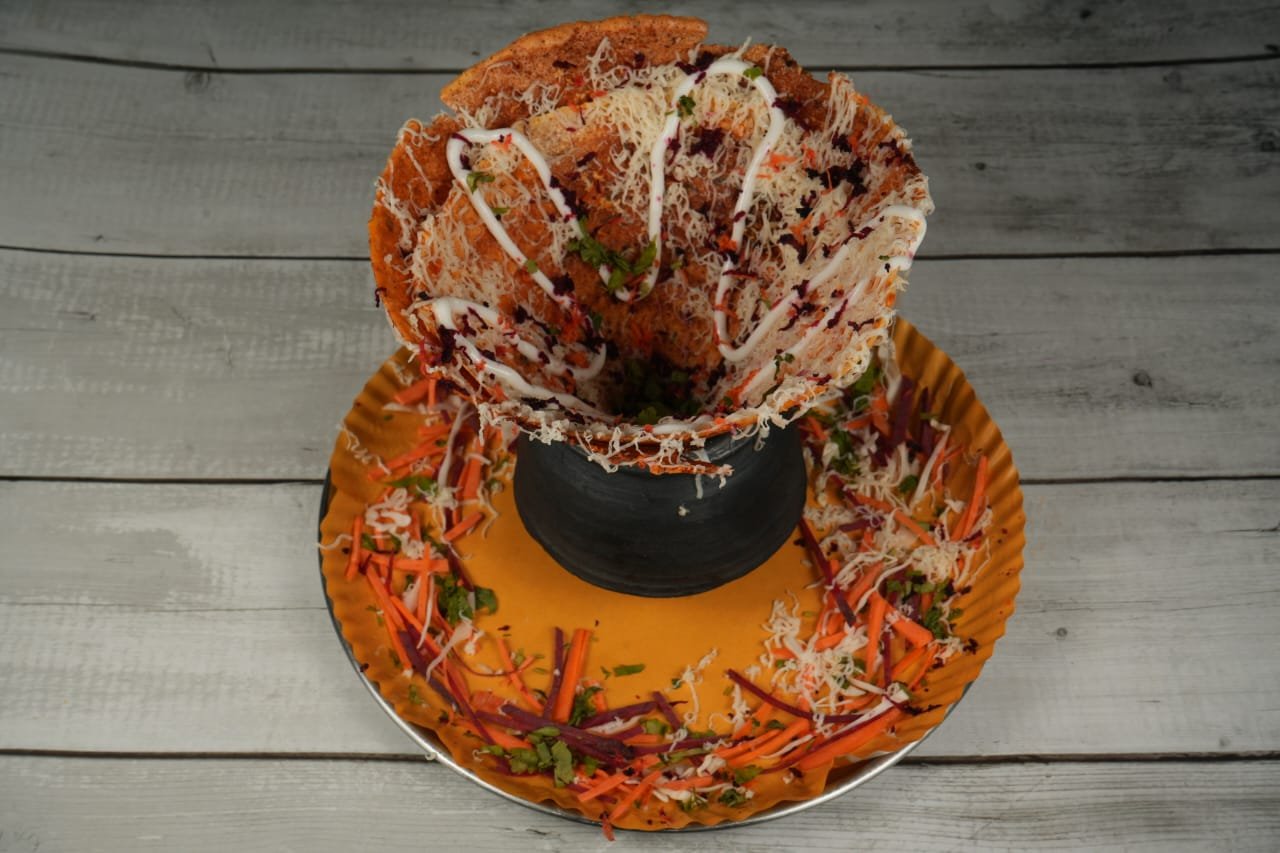 Matka Dosa is a special South Indian dosa served with flavorful masala prepared and presented in a traditional matka (clay pot) style.